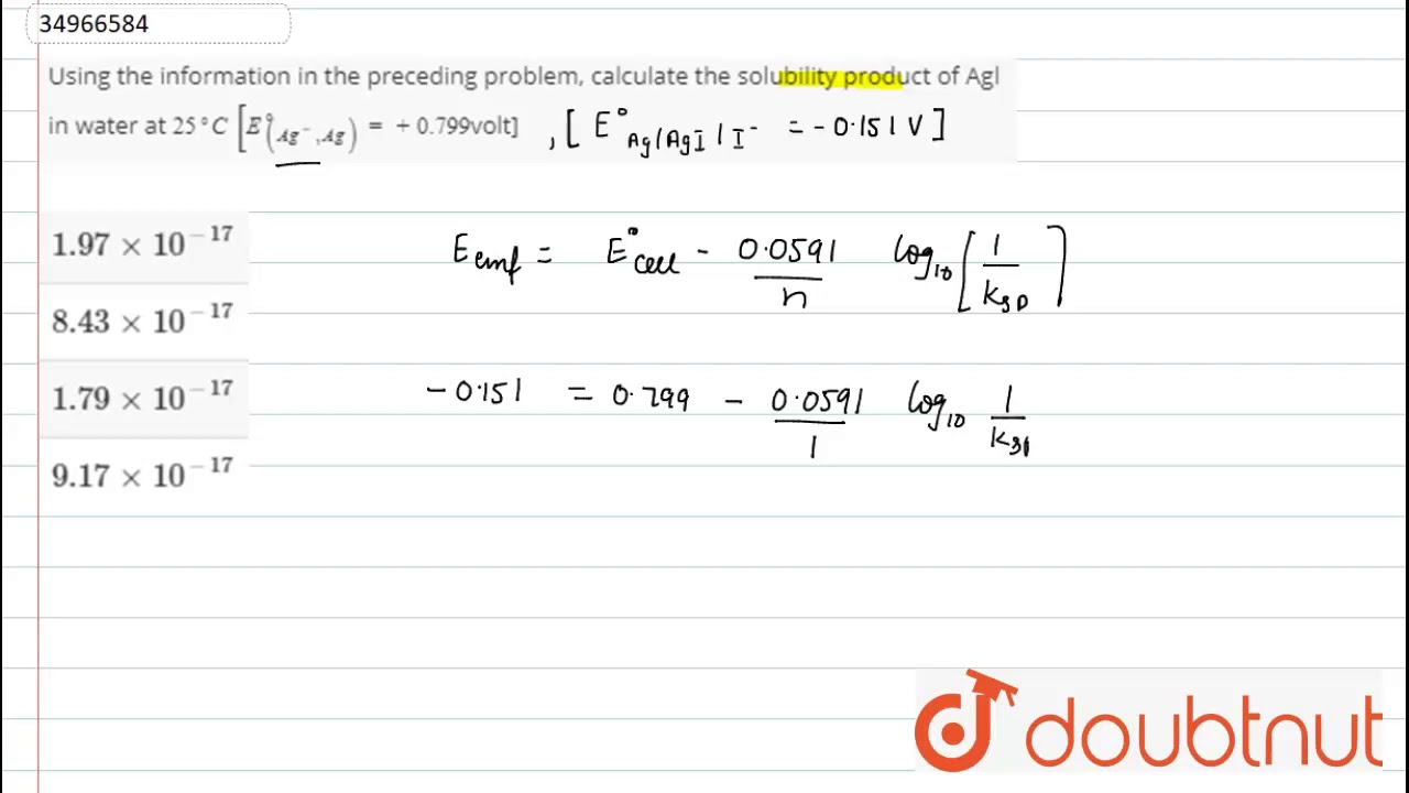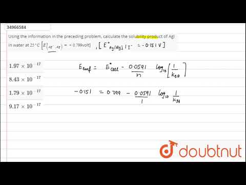 Using the information in the preceding problem, calculate the solubility product of Agl in water at `25^(@)C` `[E_((Ag^(+),Ag))^(@)=+0.799`volt]